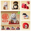 這次以「招財貓」、「福狸」、「紅牛」與「狛犬」、「不倒翁」為設計,但他們全都換上了一臉疲累、想睡覺、不想幹了的超厭世表情!每一款緣起物都有一則小簡介,像是已經厭倦幫人招來財運的招財貓,只想把那一直舉著的小貓手靠在金幣上休息;而使用會津糊紙工藝製成的緣起物-紅牛,總是擺著頭的紅牛